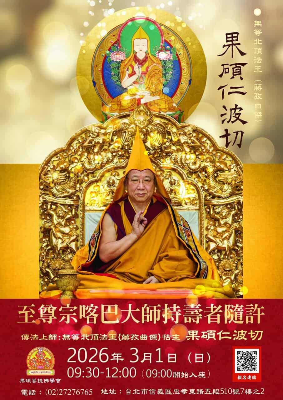 3/1(週日)台北果碩菩提佛學會傳授《至尊持壽者(持壽宗喀巴大師)隨許》。
